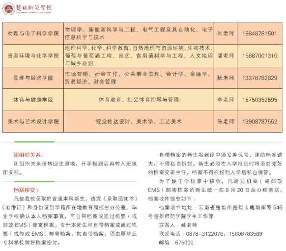 5.放弃就读:如考生被录取后不愿意就读的,请收到录取通知书后向我校提交“自动放弃入学资格”书面申请(模板可到学校招生网“下载专区”下载,网址:http://zs.cxtc.edu.cn)。申请书经考生本人及家长签名按手印后与录取通知书一并寄回,以便能及时将考生的电子档案退回生源所在地招办。邮寄地址:云南省楚雄州楚雄市鹿城南路546号楚雄师范学院招生办公室。收件人:余老师。邮政编码:675000。
