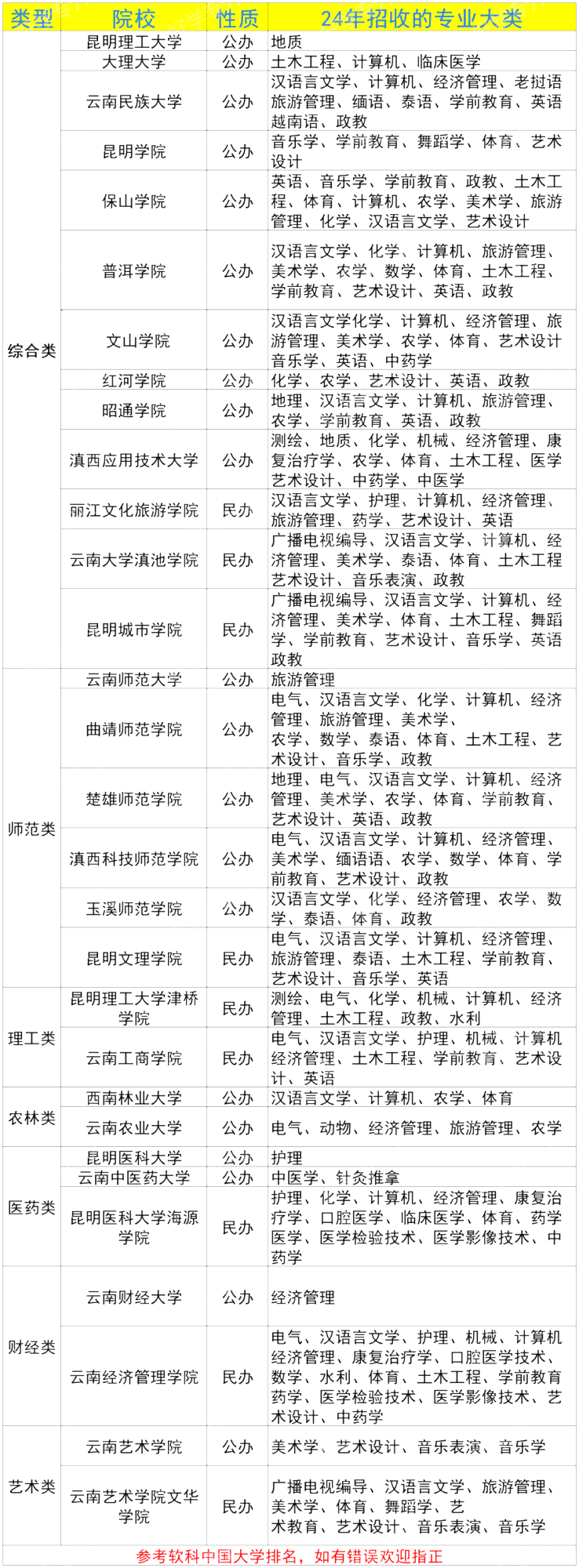 云南专升本综合类院校有昆明理工大学、大理大学、云南民族大学、昆明学院、保山学院、普洱学院、好学、文山学院、红河学院、昭通学院、滇西应用技术大学、丽江文化旅游学院、云南大学滇池学院、昆明城市学院。云南专升本各类型高校特点参考如下。